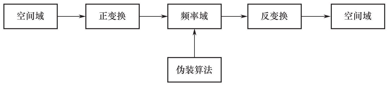 在频率域上进行信息伪装有两个关键环节:一个是需要选取空间域到频率域的变换方法,目前应用于二维离散数据的频率变换方法主要有离散傅里叶变换(Discrete Fourier Transform,DFT)、离散余弦变换(Discrete Cosine Transform,DCT)及离散小波变换(Discrete Wavelet Transform,DWT)等;另一个是在频率空间中选取合理的信息伪装算法,对需要保护的信息进行伪装处理。