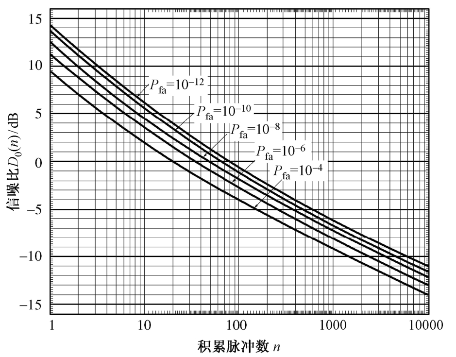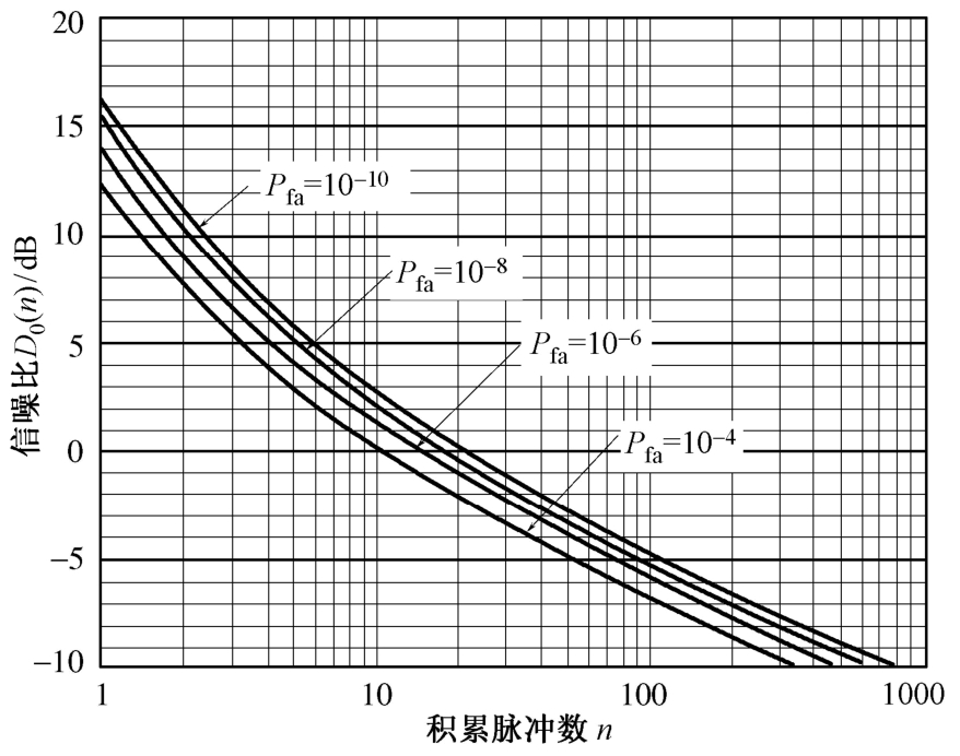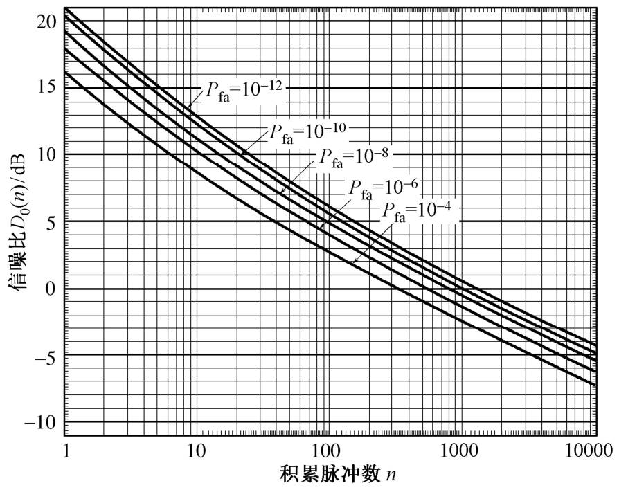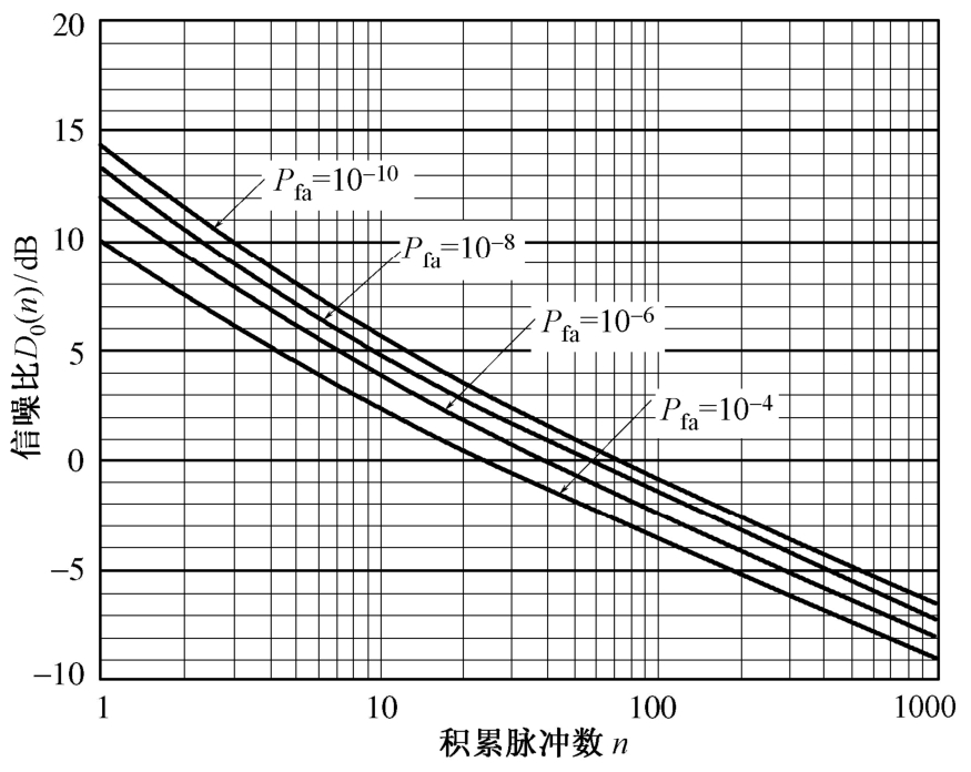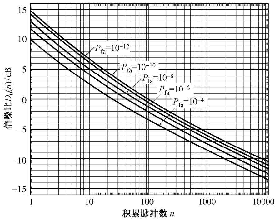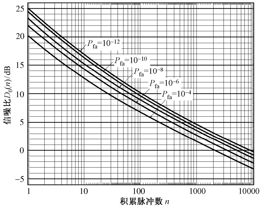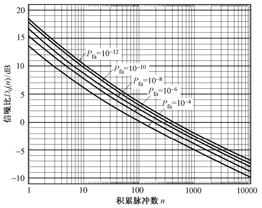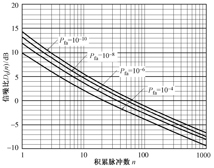 式(3.25)中, n 是积累脉冲数, D 0 (1)是对给定检测概率所需的单个脉冲信噪比, D 0 ( n )是对同样检测概率积累 n 个脉冲所需的单个脉冲信噪比。
