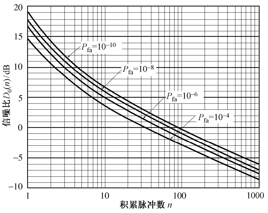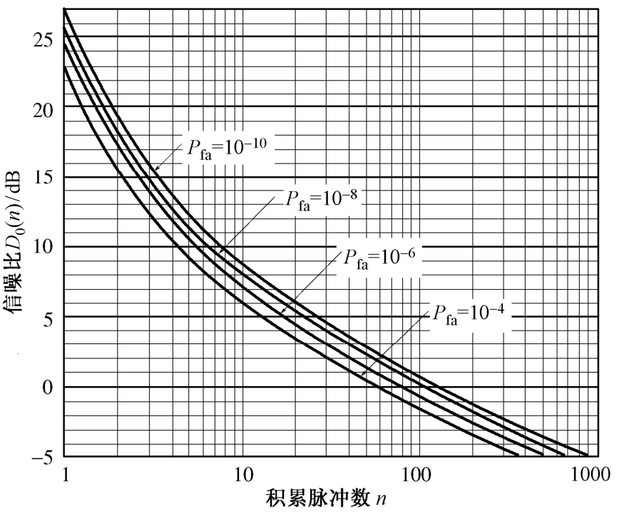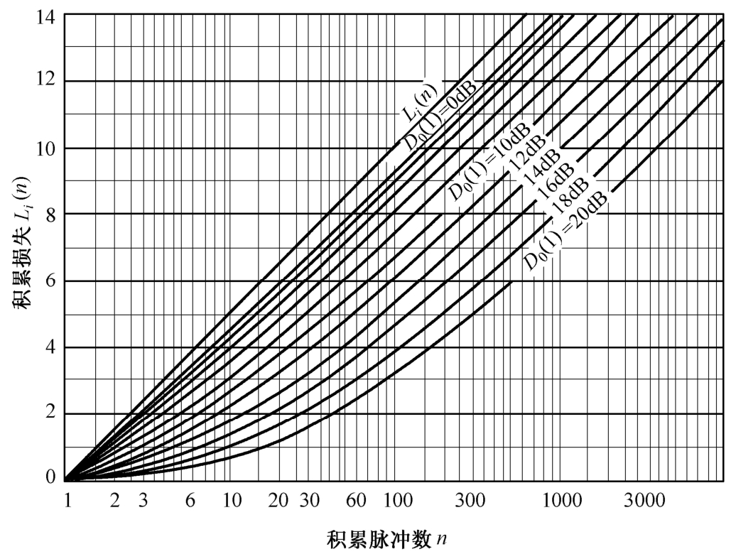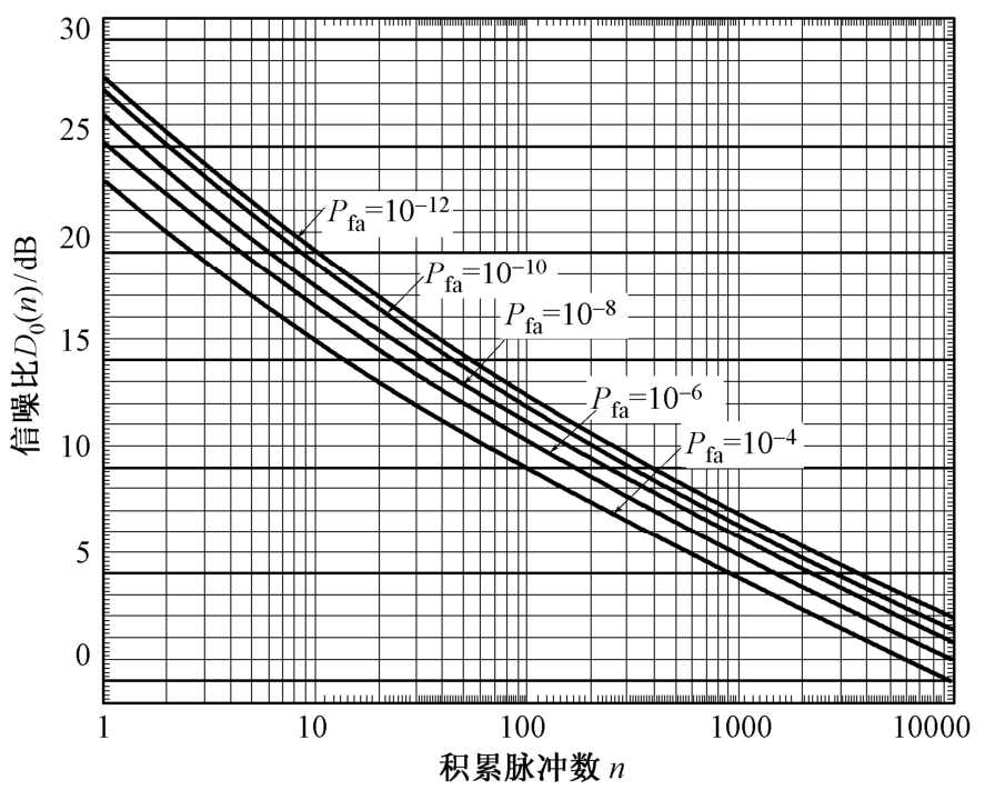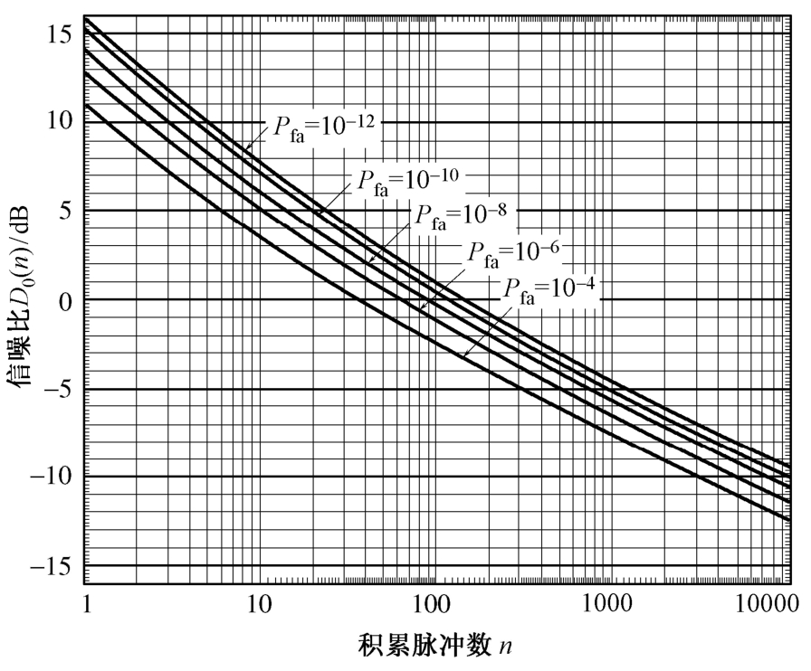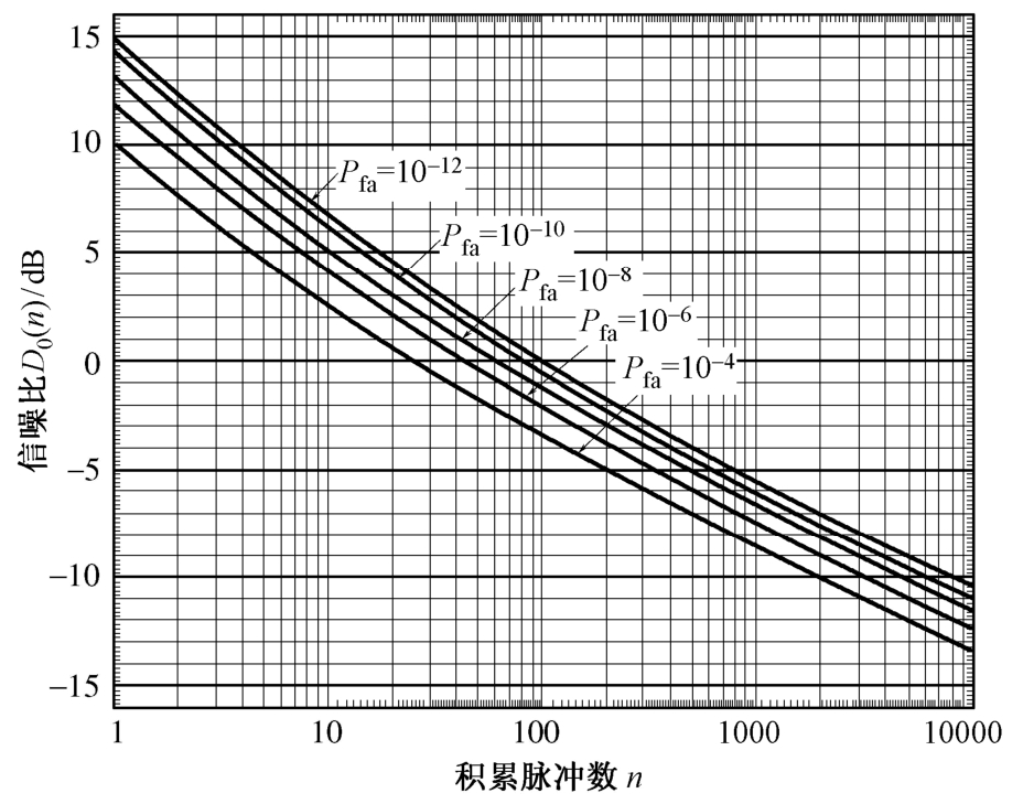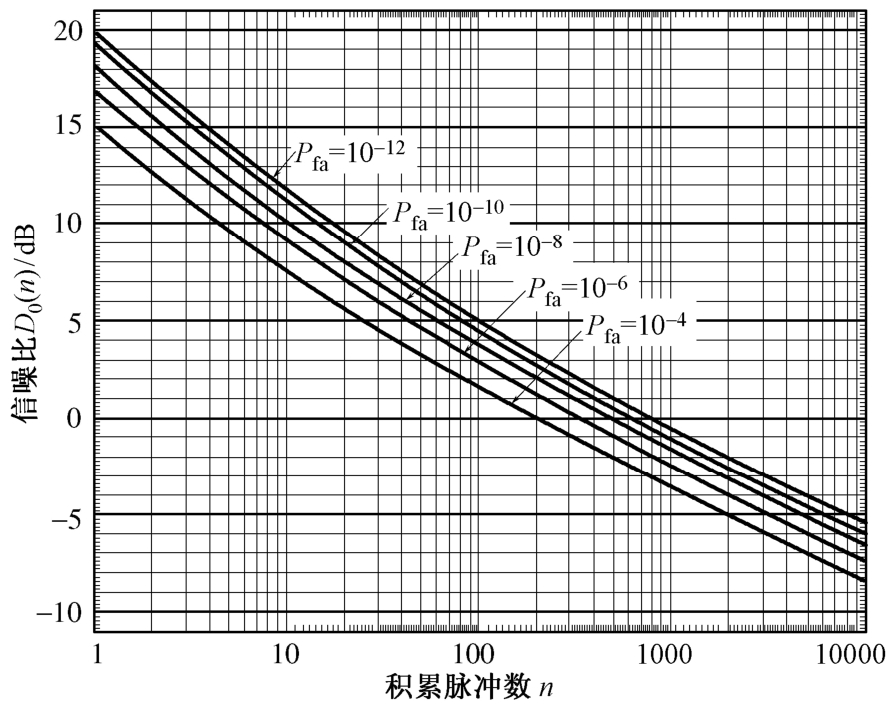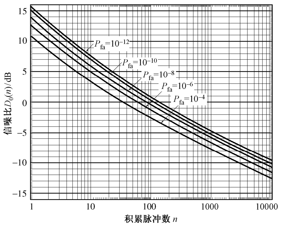 式(3.25)中, n 是积累脉冲数, D 0 (1)是对给定检测概率所需的单个脉冲信噪比, D 0 ( n )是对同样检测概率积累 n 个脉冲所需的单个脉冲信噪比。