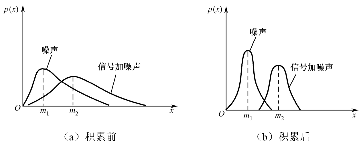 图3.8 噪声与信号加噪声在积累前、后的概率密度函数分布