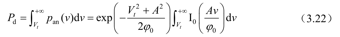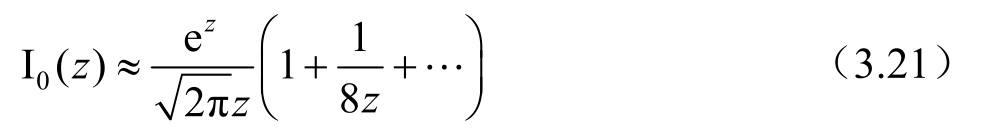 式(3.20)中, v 是信号加噪声的包络, φ 0 为噪声方差,I 0 ( · )是零阶修正型正贝塞尔函数。当 z 值很大时,I 0 ( z )可近似表示为