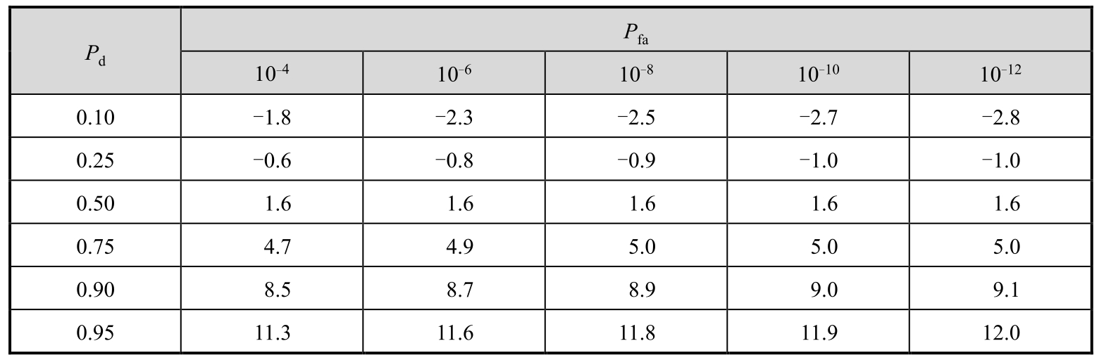 式(3.27)的通用性取决于 H n 和 ζ 是如何计算的, H n 取决于非相参积累器的加权值和信号功率的变化情况, ζ 取决于包络检波器或通带滤波器的特性。在均匀加权积累、恒定信号功率电平和平方律检波的情况下,取 H n = n , ζ =1;在理想加权积累、恒定信号功率电平和线性检波的情况下,取 H n = n , ζ =0.915。在均匀加权积累、高斯信号功率电平和平方律检波情况下,取 H n =0.473 n , ζ =1;在理想加权积累、高斯信号功率电平和线性检波的情况下,取 H n =0.532 n , ζ =0.915。其中,如果计算时已考虑了波束形状损失,此处就不考虑高斯信号功率电平对等效积累脉冲数的限制,即取 H n = n ;采用线性检波或平方律检波引入的误差较小,同时目前监视雷达大多采用射频/中频直接采样形成I/Q信号,其滤波器特性接近归一化理想值,一般在工程计算上不再引入该项误差。需要注意的是以上公式是经验公式,在0.1≤ P d ≤0.9和10 -12 ≤ P fa ≤10 -4 范围内都是正确的,符合监视雷达的应用场景。