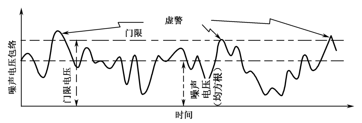 噪声是平稳随机量,噪声背景下虚警概率与噪声电平及检测门限直接相关,如图3.3所示,其中实线表示噪声电压的包络,门限电压和噪声均方根值则用水平虚线表示。噪声电压有时会超过门限,这时就产生虚警。