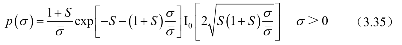 SWL-3和SWL-4目标起伏模型可视为目标由一个反射较强的大散射体和许多独立的小散射体组成,前面已经指出,这类目标服从 χ 2 分布,参量 m =2。实际上这是莱斯(Rice)分布,其概率密度函数可以写成