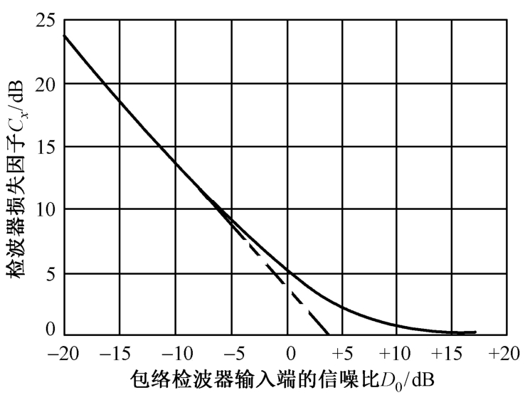 非相干检测的检测因子比相干检测的检测因子大,这是由于非相干检测处理中未考虑目标信号的相位信息,它们的比值等于包络检波器的损失因子 C x (1),导致非相干检测要达到规定的检测概率需提高输入端的信噪比。 C x (1)有时被描述为“小信号抑制”损失,它在高检测概率和弱信噪比情况下对积累效率的影响很大。对于单个脉冲检测的情况,该损失的影响不是很明显。当 P d =50%、 P fa =10 -4 时, C x (1)=0.8 dB;当 P d =90%、 P fa =10 -6 时, C x (1)=0.4 dB。检波器损失因子与包络检波器输入端信噪比的函数关系如图3.7所示。