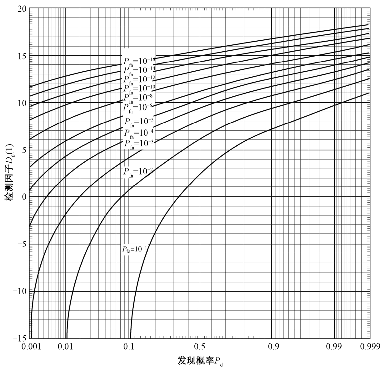 图3.6所示曲线是以虚警概率 P fa 为参变量,单个非起伏目标的检测概率 P d 与所需检测因子 D 0 (1)之间的关系。这些曲线可直接用于计算单个非起伏目标的检测概率,同时也可用作实际雷达或检测器自动计算检测概率和检测因子的起始值。