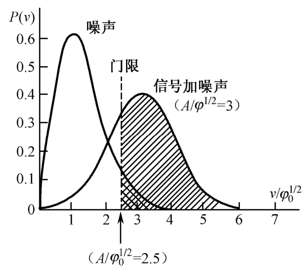 时,曲线下的面积就是检测概率,而只有噪声存在时,包络超过门限电压的概率就是虚警概率。显然,当门限