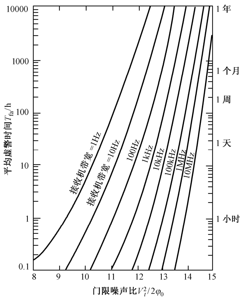 平均虚警时间 T fa 的意义是产生一次虚警的平均时间。同样,如果噪声电平超过门限电压 V t 的时间间隔为 T i ,则门限电压平均时间为