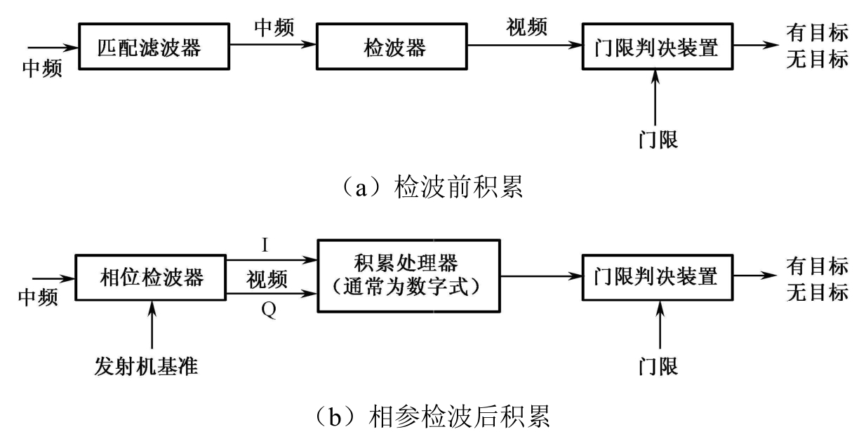 监视雷达的信号检测通常是在多个脉冲积累的基础上进行的,信号积累可以增加噪声和信号加噪声两种概率密度函数曲线峰值之间的间隔(参见图3.8),提高信号检测效率。信号积累可以是相参积累,也可以是非相参积累。通常把包含目标幅/相信息的积累过程称为相参积累,而只有信号幅度的积累过程则称为非相参积累。相参积累保留了目标信号的相位信息,相当于矢量叠加,因而能获得最佳积累效果。非相参积累因没有了目标信号的相位信息,相当于标量(幅度)叠加,信号积累的效率较低。目前的监视雷达多脉冲检测一般采用相参积累,对于近程监视雷达和固定指向监视雷达,由于脉冲数较多,一般采用多组脉冲串处理,在脉冲组内进行相参积累,脉冲组间进行非相参处理,以避免由于目标机动带来的跨越损失。