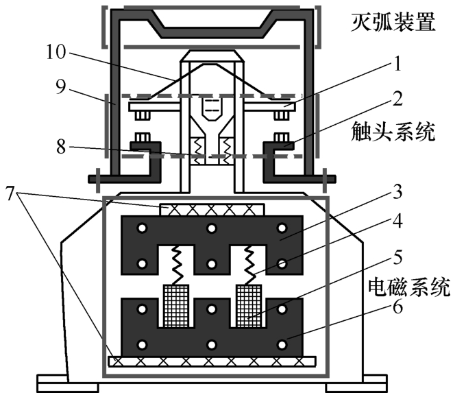 1—动触头 2—静触头 3—衔铁 4—弹簧 5—线圈 6—铁心 7—垫毡 8—触头弹簧 9—灭弧罩 10—触头压力弹簧