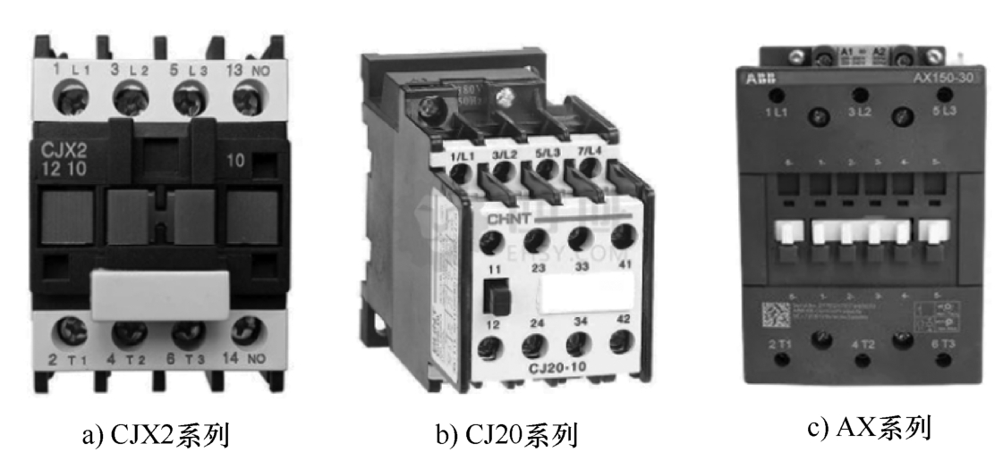 目前,我国常用的交流接触器主要有CJ20、CJX1、CJX2、CJ12和CJ10等系列;ABB的AX系列、AF系列等;施耐德电气的EasyPact TVR、TeSys Deca接触器等。常用的直流接触器有CZ18、CZ21、CZ22和CZ10、CZ2等系列。常用的交流接触器外形如图1—5所示。