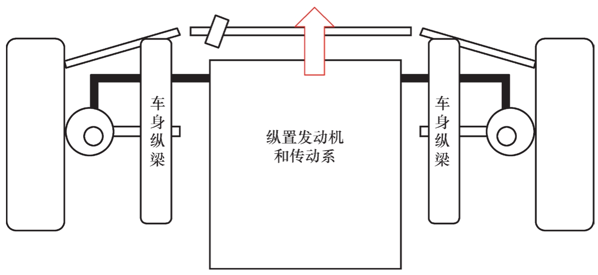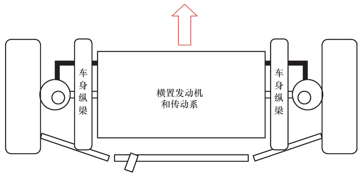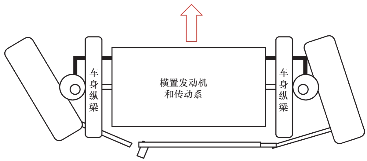 图2.11 横置发动机与纵梁以及转向系统的布置关系