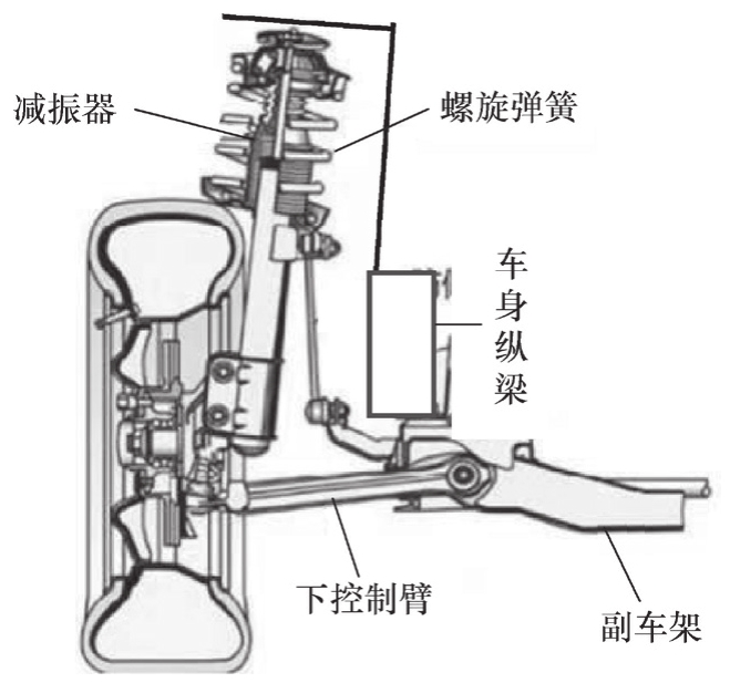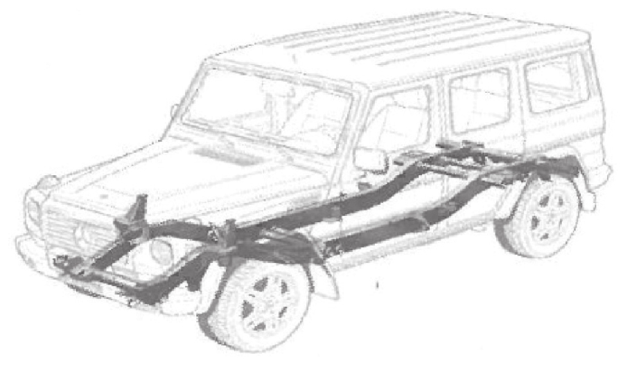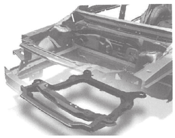 车身结构件或车身骨架是车身的核心结构,其中车身纵梁一般是车身最主要的骨架部件。带有副车架结构的汽车,因副车架需承受悬架杆件传递来的所有轮胎侧向力、纵向力、部分垂向力和回正力矩、侧翻力矩等,所以必须安装在前纵梁较为坚固的部位(图2.9)。