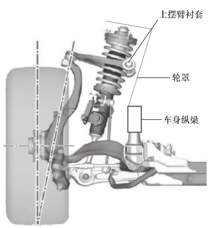 运动学分析方法利用专用软件根据悬架几何以及悬架的最大转向位移和悬架行程,创建一系列车轮主轴线位置和角度,这一系列的主轴线用于产生轮胎包络。考虑到悬架变形的影响,在轮胎包络上添加预定的误差量。动态变形分析是目前主要依赖的分析方法,采用动态分析软件建立前后悬架准确的悬架几何、衬套和其他弹性件数据曲线(包括悬架限位块)甚至包括一部分结构件柔性,通过悬架的全方位运动和各种精心设计的负载工况捕捉轮胎运动的极端情况,使得车轮垂向位移至最大有效行程和转向运动至最大齿条行程,并且增加轮胎侧向载荷以模拟转弯工况。产生一个反映主轴运动的包括车轮中心位置和主轴方向的主轴文件,设计软件读入该主轴文件即可生成轮胎包络。