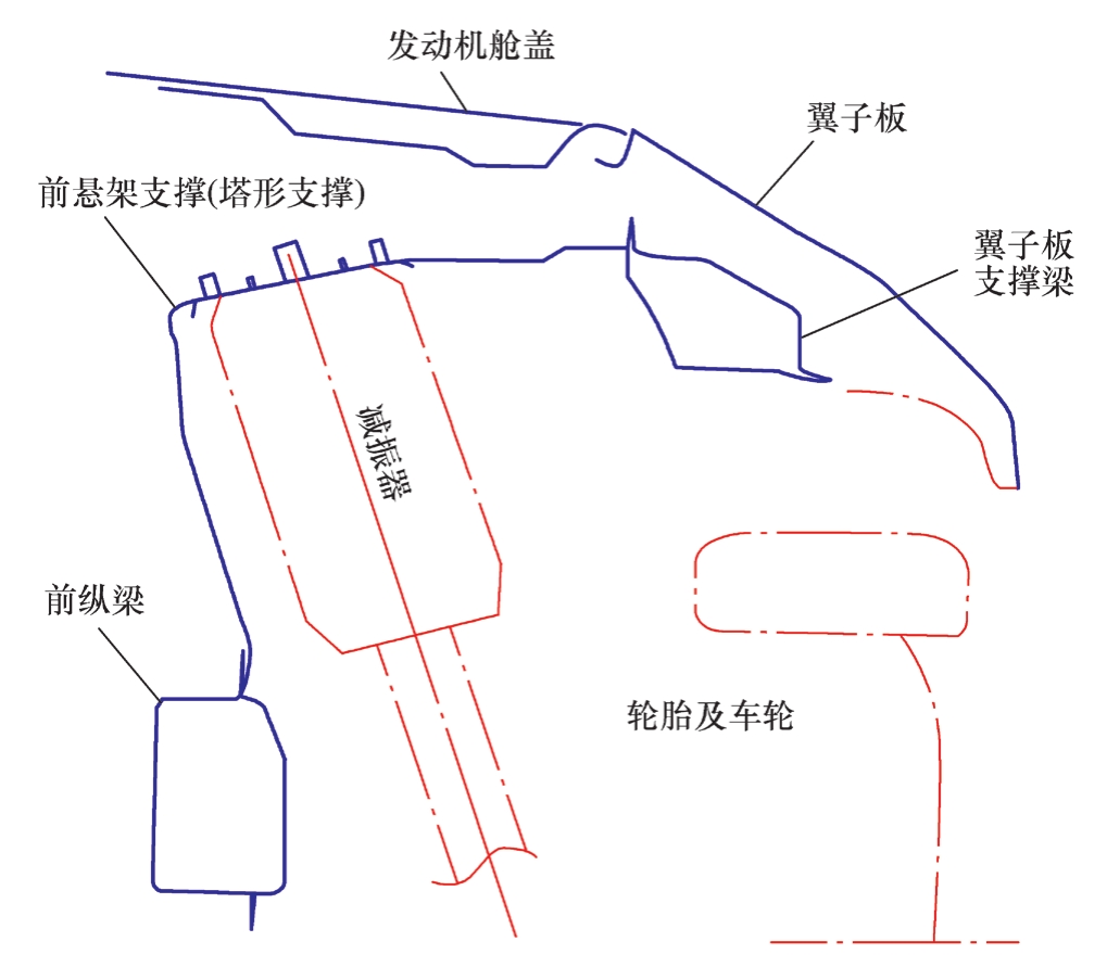 悬架的阻尼力、弹簧力和缓冲限位块力通常直接作用到车身上,最大弹簧和减振器动态力一般在千牛级,而限位块最大的动态力通常在万牛级。图2.10为承受减振器力的车身塔座部位结构图。有些动力总成悬置的抗扭衬套也直接连接到下车体上,因此,车身必须有足够的局部强度和刚度。车身上通常采用加强梁以提高车身的局部强度和刚度,加强梁是下车体的一部分,不可拆卸。