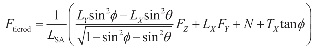 车辆匀速转弯行驶时,轮胎垂向载荷会发生横向转移,轮胎产生侧向力、回正力矩以及翻转力矩(Overturning Moment),所有这些都会通过转向主销几何产生转向回正力矩,并根据转向臂长转换为转向横拉杆载荷。单侧转向横拉杆载荷 F tierod 与以下五个悬架设计参数有关:侧视图转向臂长 L SA 、主销后倾角 ϕ 、后倾拖距 L X 、主销内倾角 θ 和摩擦力矩臂 L Y 。转向横拉杆载荷可以表达为: