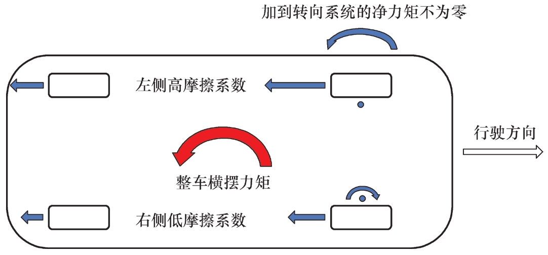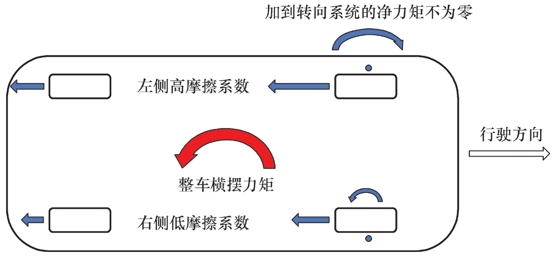 如果制动时左右两侧轮胎与地面间的摩擦系数相同,且左右载荷对称,则摩擦半径不会影响制动稳定性。当上面任一条件不满足时,如摩擦系数不同或轮荷不同,则左右两侧的制动力不对称,摩擦半径会影响制动稳定性。当摩擦半径为正时,高摩擦系数或高制动摩擦力一侧本身就会产生加到车身的横摆力矩,而正摩擦半径会对转向主销形成附加的转向力矩,加到转向系统的净力矩加剧车身横摆引起跑偏,或制动时行车方向不稳定(图3.24)。当摩擦半径为负时,加到转向系统的净力矩与制动力本身加到车身的横摆力矩方向相反,因此可以减少制动跑偏(图3.25)。