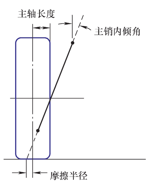 图3.20 前视图中主销内倾角、主轴长度和摩擦半径的定义