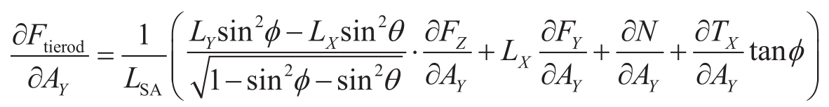 转向工况下,轮胎力的所有分量都和侧向加速度有关。在轮胎力的线性范围内施加在转向横拉杆上的载荷随侧向加速度的增加而增加。在中心区线性假定并忽略摩擦力的前提下,可以推出转向横拉杆载荷梯度