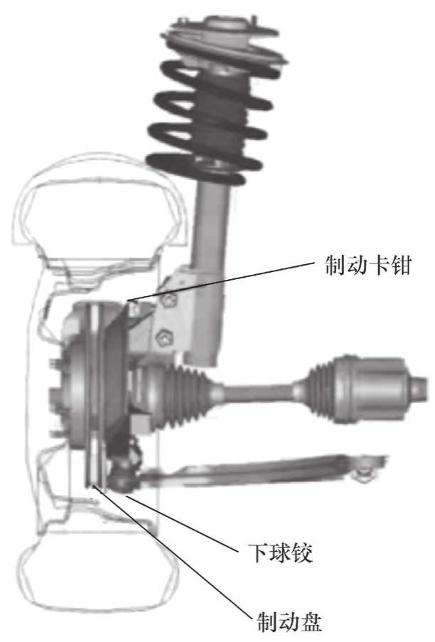 下球铰的垂向位置由离地间隙决定的内衬套高度和侧倾运动中心高决定的摆臂角确定,通常应尽可能高,以提高离地间隙,但会受到驱动轴外球铰外壳布置的限制。下球铰的侧向位置需要尽可能外移,这需要将制动卡钳尽可能外移,使之与轮辋之间的间隙最小。但下球铰的外移量受制动盘位置的限制,如果距离太近,下球铰要承受来自制动盘的高温,因此有最小间隙要求(图3.21)。