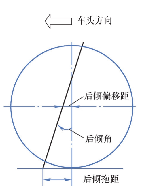 图3.23 侧视图中主销后倾角、后倾拖距和后倾偏移距的定义