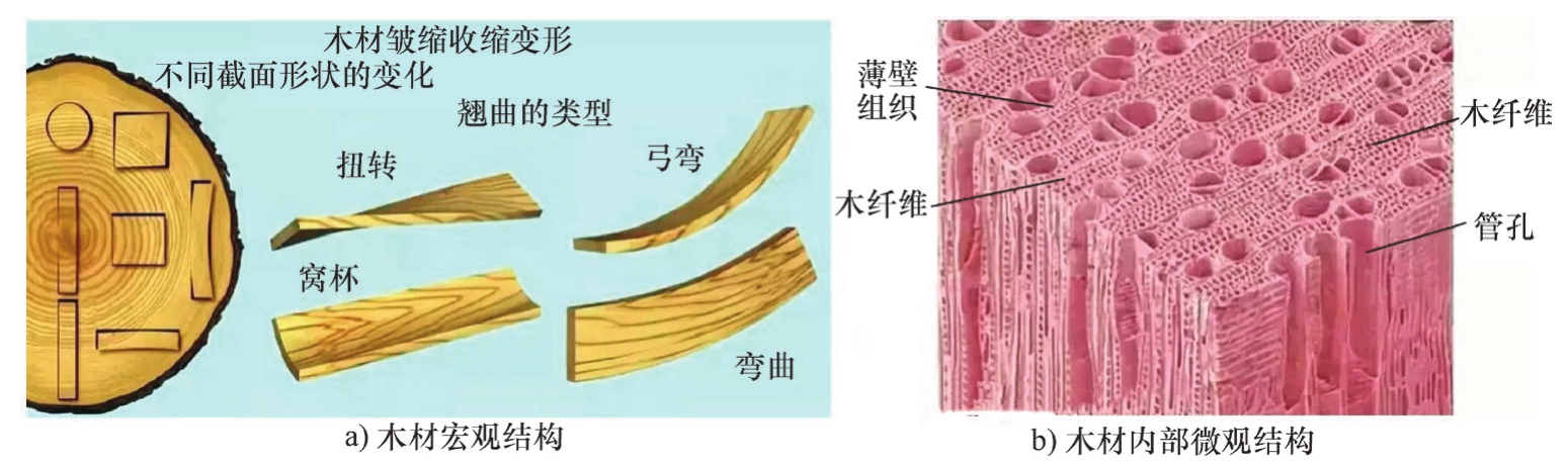 对于宏观力学,一般各向异性弹性体与各向同性弹性体的本构关系有本质不同,要复杂得多。例如,木材属多孔性复合材料,大孔隙如细胞腔和纹孔等,小如微纤丝间隙,水分很容易渗透进木材内部使其膨胀,引起尺寸变化,即木材的干缩湿胀性能。木材内部微观结构如图2.3b所示。更重要的是,木材为各向异性材料,各方向上随木材含水率变化而不均匀胀缩,易产生翘曲、变形、开裂等缺陷,如图2.3a所示。木材不稳定是因为它是“活”的,会受环境影响而变化,又因为各部分受到的影响变化反应不一样,因此会引发缺陷。在木制品设计过程中,为使木材变得“听话”,必不可少的是轻量化设计。