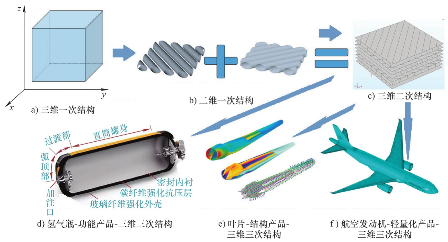 三维初始弹性模型,三维一次结构;单层板、单向板,单层设计,二维一次结构:层合板,铺层设计,三维二次结构:实际工程产品结构,结构、功能及轻量化设计,三维三次结构:可在同一工艺流程中制作或形成,这也是复合材料的特性之一,如图2.1所示。