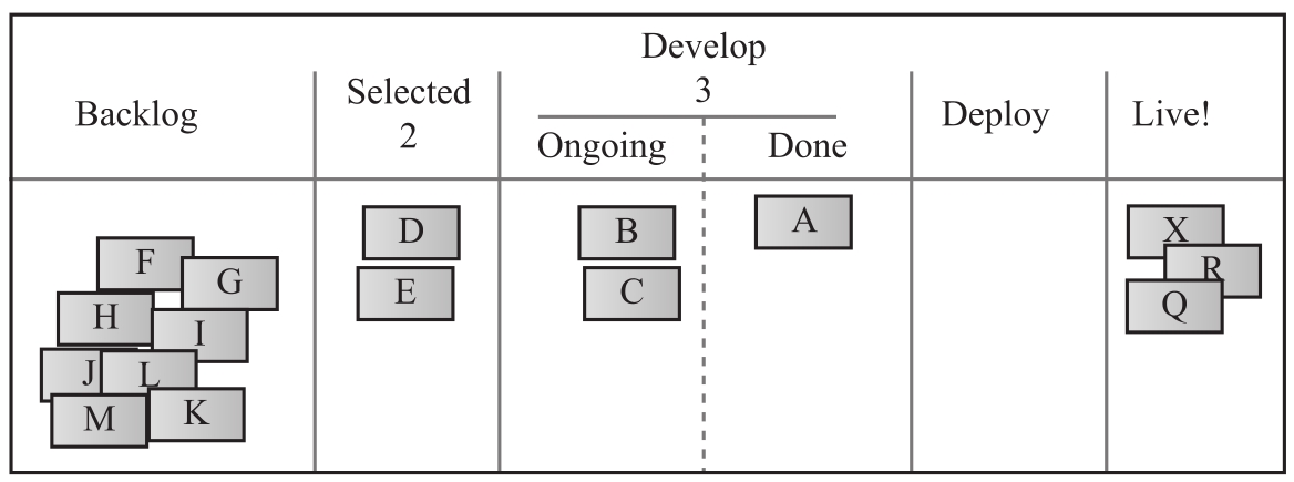 栏目顶部的数字代表该步骤的最大工作项容量。Kanban通过限制进行中的工作项的数量,防止过度生产,并动态地揭示开发过程中的瓶颈。进行中的工作项(work in progress, WIP)称为在制品。团队通过将在制品与团队能力的匹配来达到软件的“及时”(just in time, JIT)开发。
