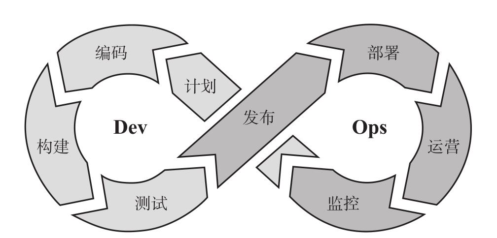 DevOps是敏捷过程在完整的软件生命周期上的延伸,从文化、自动化、标准化、架构以及工具支持等方面,打破开发与运维之间的壁垒,在保证高质量的前提下,缩短产品交付的周期。DevOps始于计划,覆盖编码、构建、测试、发布或交付、部署、运营和监控等阶段,如图2-10所示。这是个“无穷环”,因为DevOps的根本理念是“持续”,也就是“没有终点”。“无穷环”也象征着软件开发与运维过程中短周期、高质量的交付和快速的反馈。