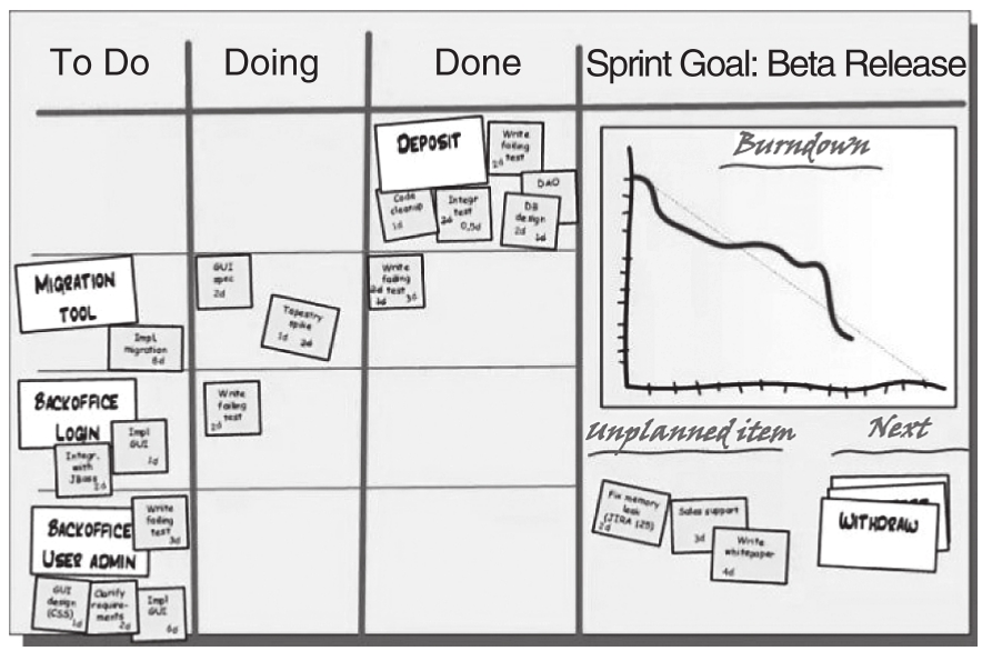 Scrum采用任务板来可视化软件开发的进展,它可以是一个大白板,也可以使用软件,如图2-8所示 [2] 。任务板上展现了当前Sprint的所有任务,每项任务用一张“即时贴”来代表,上面记录着任务的名称、优先级、接受任务的开发者姓名、预计的完成时间等信息。任务板上有3列:待处理的任务(To Do),即Sprint中要着手的待办事项或用户故事(user story);进行中的任务(Doing),即团队成员已经认领的、正在处理的任务;已完成的任务(Done),即团队成员已经完成的、被关闭的任务。在Sprint过程中我们要不断地更新任务板。