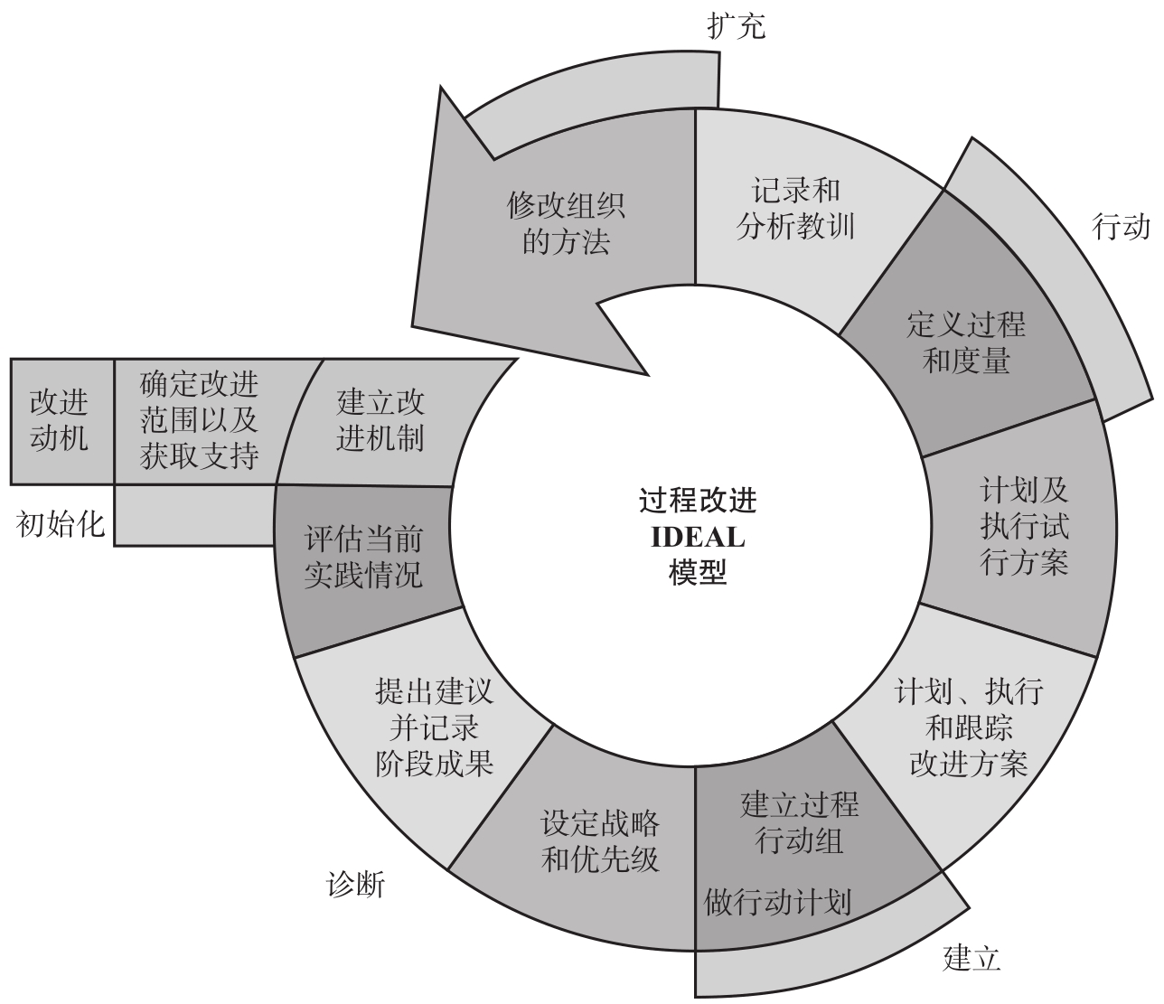 IDEAL定义了初始化(Initiating)、诊断(Diagnosing)、建立(Establishing)、行动(Acting)和扩充(Leveraging)五个阶段。其中初始阶段是组织层上下同心、拟定目标和愿望的阶段,这是对未来有一个共同思考的过程;诊断阶段采用评估的工作,对组织现状进行分析,发现存在的缺点和问题,并根据组织战略要求,确定需要进一步改进的方向;建立阶段制定相应的规则、模板和过程,作为改进实施的基础;行动阶段则是一个不断试点、总结、推广的过程,在这个过程中组织的所有人员都积极参与,在提高技能、绩效的同时,也在提高组织对过程改进的信心;扩充阶段进行总结、再学习和提高。