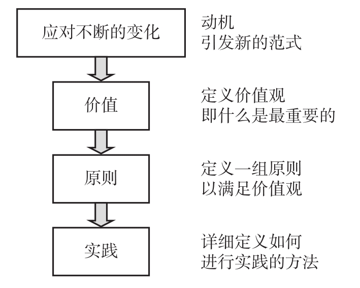 敏捷过程的框架分为四个层次:动机、价值、原则和实践,如图2-6所示。