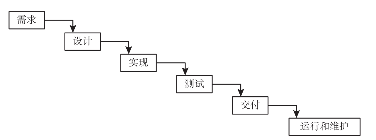 1970年Royce提出了著名的线性顺序模型,又称瀑布模型(waterfall model)。正如它的名字一样,瀑布模型将软件过程中的各项活动规定为依固定顺序连接的若干阶段工作,形如瀑布流水,最终得到软件产品。这些顺序执行的阶段通常为:需求、设计、实现、测试、交付、运行和维护,如图2-2所示。每个阶段的结束处都设有评审,只有通过评审才能进入后一阶段。前一阶段的中间产品是后一阶段工作的基础。