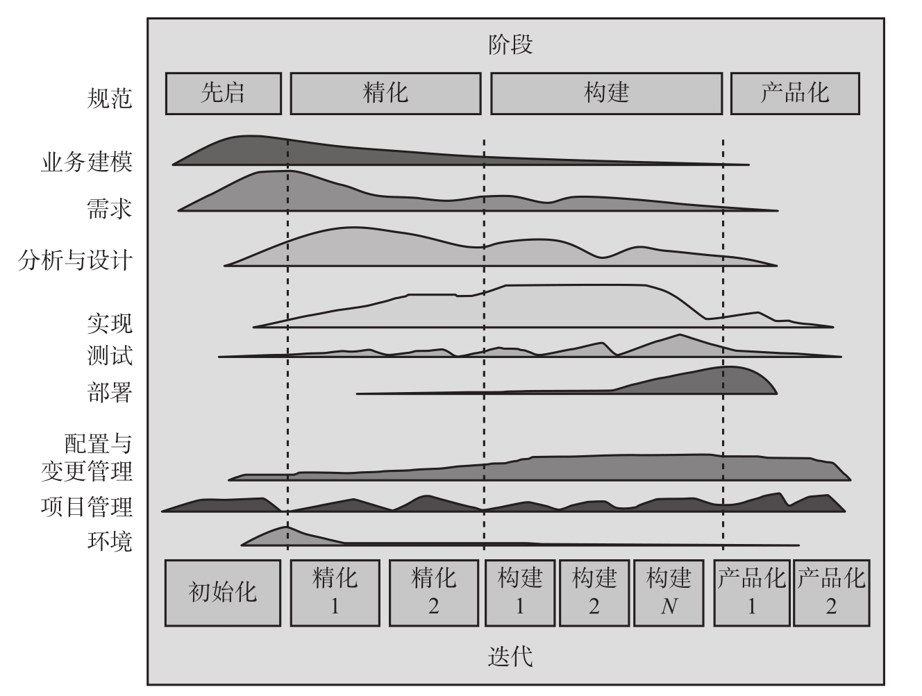 UP把软件过程分为先启(inception)、精化(elaboration)、构建(construction)和产品化(transition)四个阶段。每个阶段又可分为多个迭代,其中迭代的数量和风险相关,风险越大则迭代个数越多。每个阶段结束是一个业务决策里程碑(大里程碑),每个迭代结束是一个技术里程碑(小里程碑)。