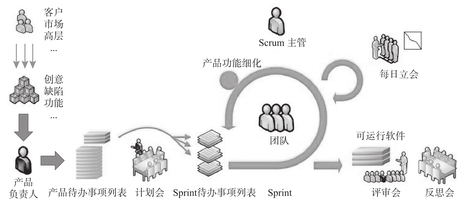 Scrum团队的目标是提高灵活性和生产能力。为此,他们自组织、跨职能,并且以迭代方式工作。每个Scrum团队都有三个角色:①Scrum主管(Scrum Master),负责确保成员都能理解并遵循过程,通过指导和引导让Scrum团队更高效地工作,生产出高质量的产品;②产品负责人(Product Owner),定义和维护产品需求,负责最大化Scrum团队的工作价值;③团队(Team),负责具体工作。团队的理想规模是5~9人,团队成员具备开发所需的各种技能,负责在每个Sprint(冲刺迭代)结束之前将产品负责人的需求转化为潜在可发布的产品模块。