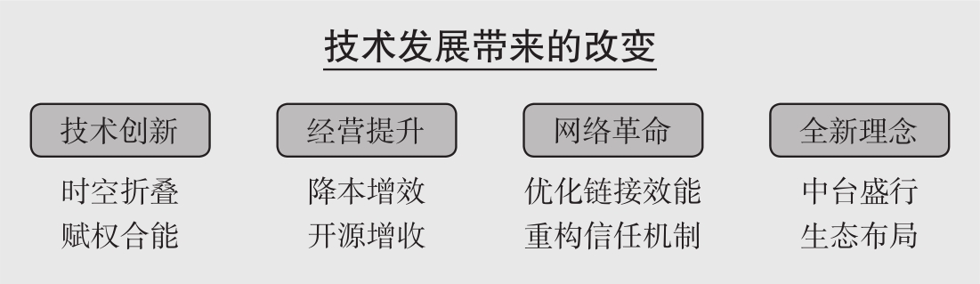 第1章介绍了在以互联网技术为核心的应用与创新下,企业通过时空折叠、赋权合能的方式,在降本增效、开源增收及经营可视化监管与决策方面获得的价值,进而延展到互联网技术对传统商业网络、商业模式带来的变革。