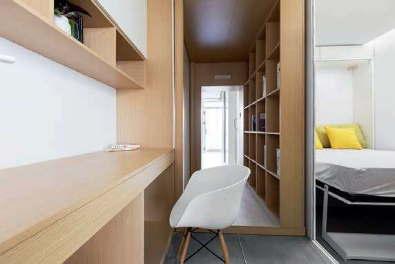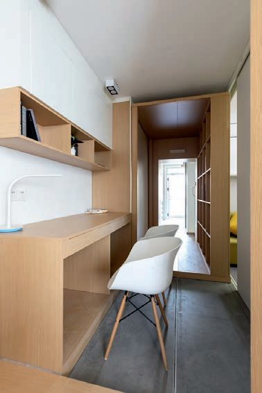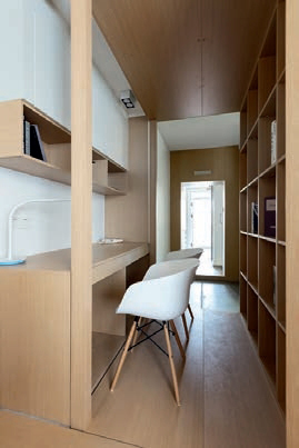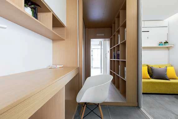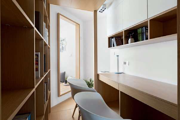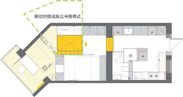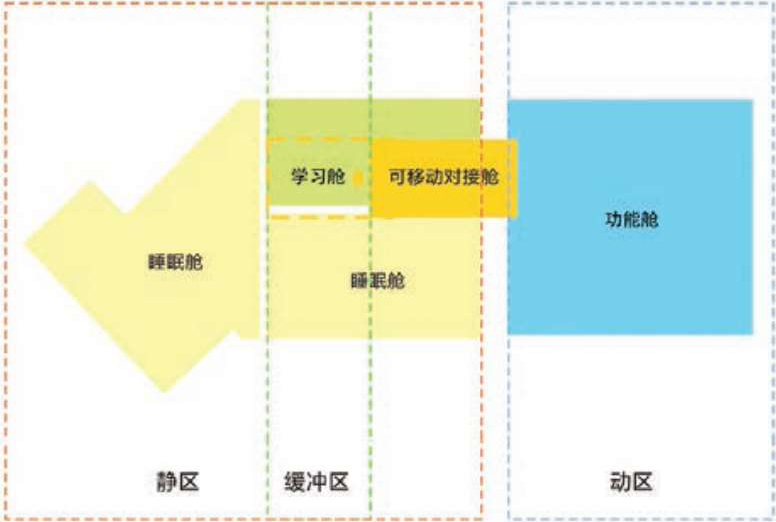 设计一组可移动的魔方舱,既是两间卧室中的缓冲空间,又可以和开放式书房对接成一间独立的书房。