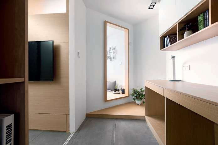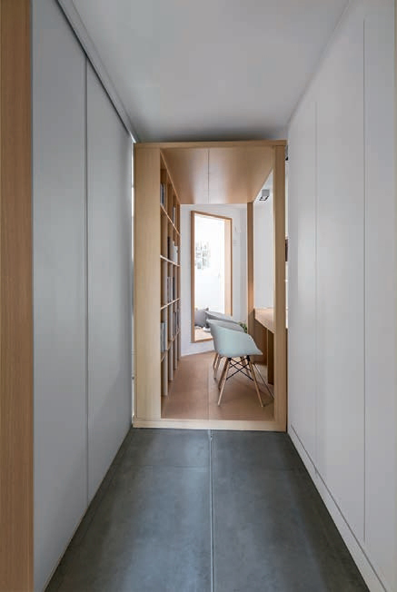 魔方舱对接到原始门洞上,形成通往卧室区域的通道,也成为全屋动区和静区之间的过渡区域,同时和右侧墙面的衣柜区域对接成一间步入式衣帽间。