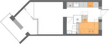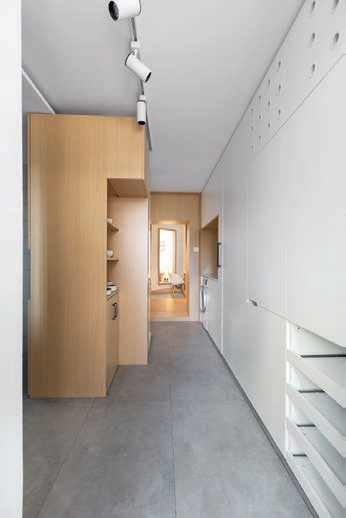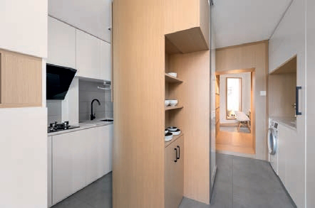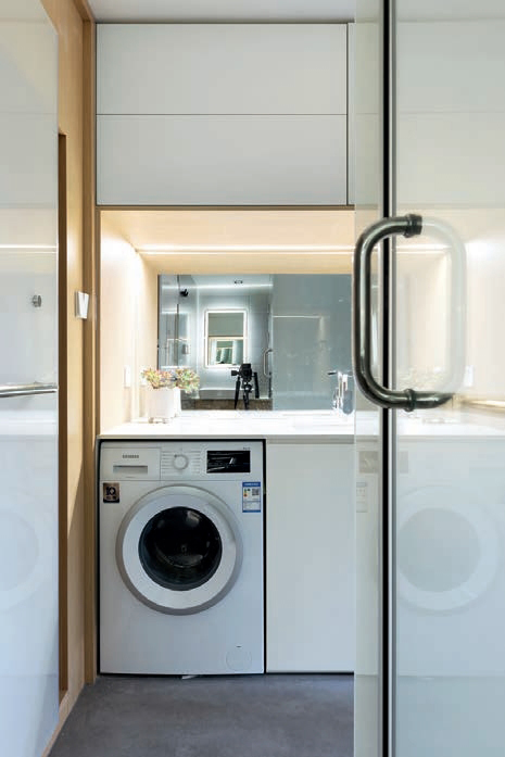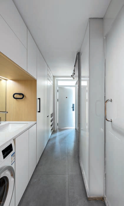 在进门的右手边设计了一组单面的魔方舱,对各种功能模块进行重新组合,此空间囊括了储物柜、鞋柜、衣柜、冰箱、洗手台、洗衣机等。