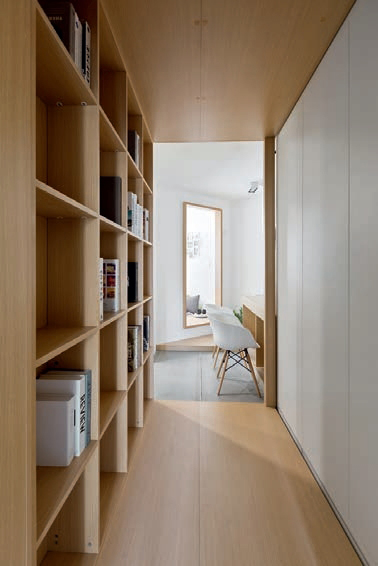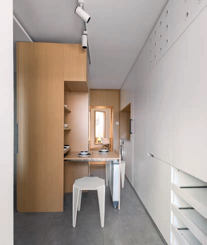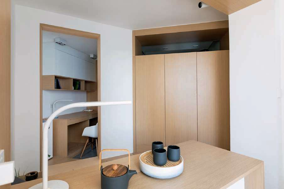 充分利用过道空间将储物柜、独立淋浴房等功能模块进行整合,提升过道空间的功能性和利用率。除此之外,与卫生间相连的储物柜中还隐藏了餐桌,打开后可以满足一家人同时用餐。