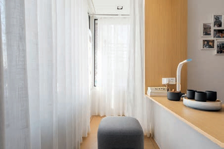 通过更换三层玻璃的断桥铝窗,增加墙体的内保温层,有效改善了阳台的内部环境。将其规划到卧室内,增大卧室的面积,利用不可拆除的配重矮墙设计一组书桌,提升卧室的功能性。