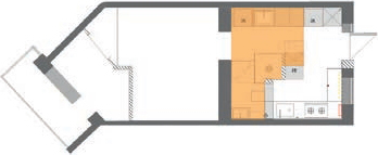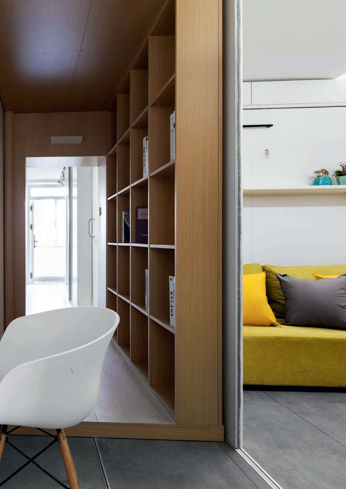 魔方舱也将左侧空间分隔成了一间客厅兼卧室,通过墙面的隐形床可将客厅随时转化为卧室。