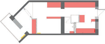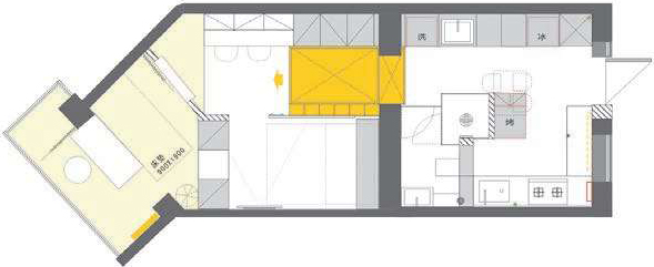 原始户型中有一面斜墙,不方便布置家具,导致空间利用率较低。经过设计之后,分隔出一间适合居住的方形卧室,将原有的斜面空间设计为休闲角,其在两个卧室间起到了缓冲的作用。