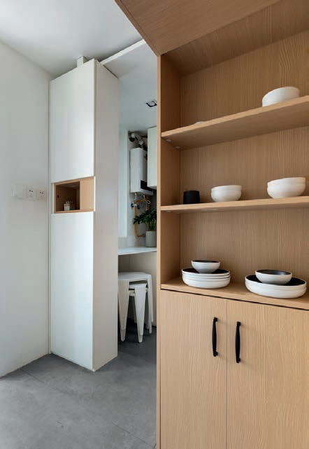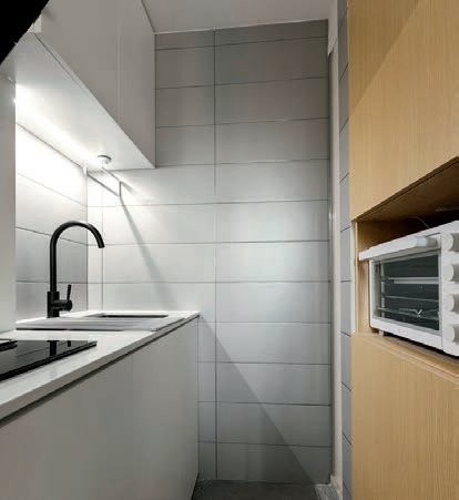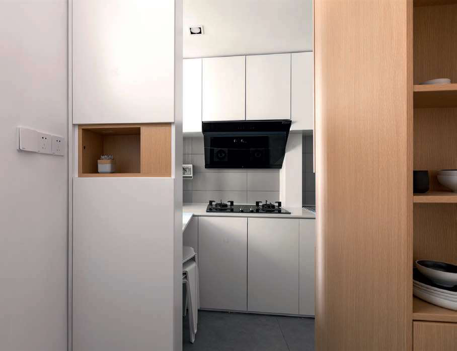将原始的厨房改为开放式厨房并将原本过道部分的空间纳入厨房中,设置高柜,增加厨房的储物空间,并内嵌小型烤箱,以满足女房主烘焙的爱好。