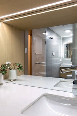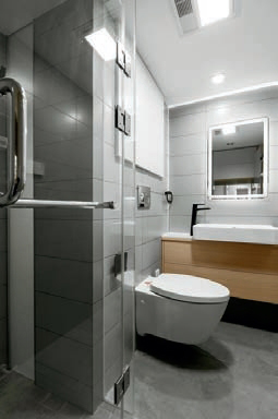 淋浴房和卫生间门全部用玻璃代替,有效地节省了空间;又将壁挂马桶的上部空间设计为储物柜,用于放置洗浴用品和卫生用品;除此之外,还额外增加了一处洗手台,多人使用时可互不干扰。