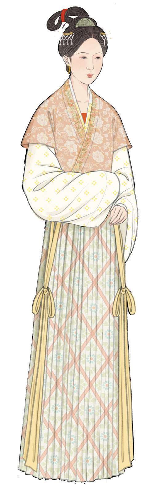 印金白罗襦+芙蓉梅花纹纱罗半臂+菱格花草纹齐腰百褶裙+鹅黄色绦带