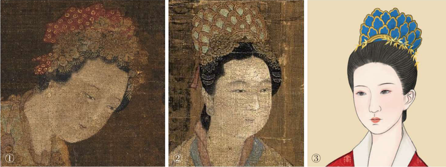 对比两宋绢本画、壁画中戴冠的女子形象,可以总结出两宋冠式与戴法的不同。北宋流行冠式偏高、偏大且敞口,多戴于头顶。南宋冠式多为相对较小的扁圆样式,顶部封口,戴的位置偏向脑后。同服饰风格一样,两宋冠式的体量、造型也从“宽博奔放”向“婉约清丽”转变。