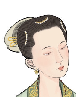 团冠中的山口冠也是一种常见的冠式,多高耸,呈现中间低、两侧高的造型样式。钱选《招凉仕女图》中左侧的女子头戴半透明的水晶山口冠,水晶透明轻盈,给人清凉之感,最宜夏季佩戴。