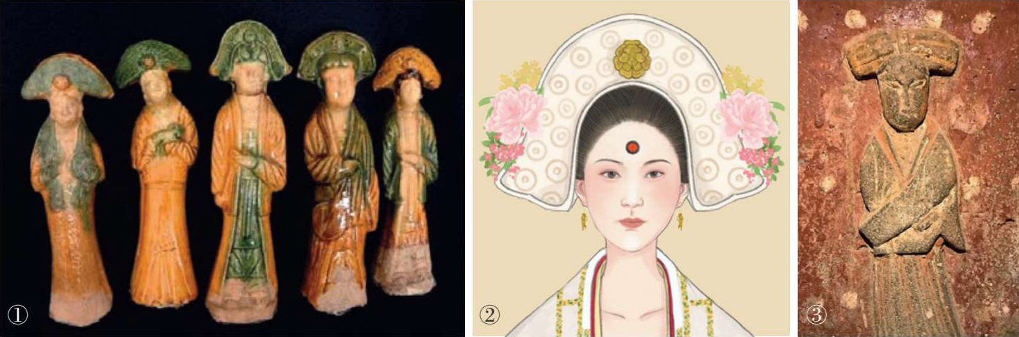 垂肩冠是从团冠发展而来的,在团冠的基础上,把伸长的地方四角弯曲而下垂至肩,冠上用金银珠翠、花朵点缀,如《大宋宣和遗事》记载:“佳人却是戴亸肩冠儿,插禁苑瑶花”。这种冠饰体量较大,装饰华贵,多流行于中上阶层的女子群体。在山西省阳泉市平定县城关镇姜家沟村北宋墓壁画《伎乐图》中,还有一种“片状”的垂肩冠,极似梅尧臣所写的“白角莹薄垂肩冠”。