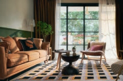 客厅以明朗活泼的配色为主,墙面以米白和复古绿做半墙的搭配,并使用了大量暖色调软装,黄与绿的配色碰撞融合,格子地毯和木制家具元素,既丰富了空间的层次,又营造出浓烈的自然气息